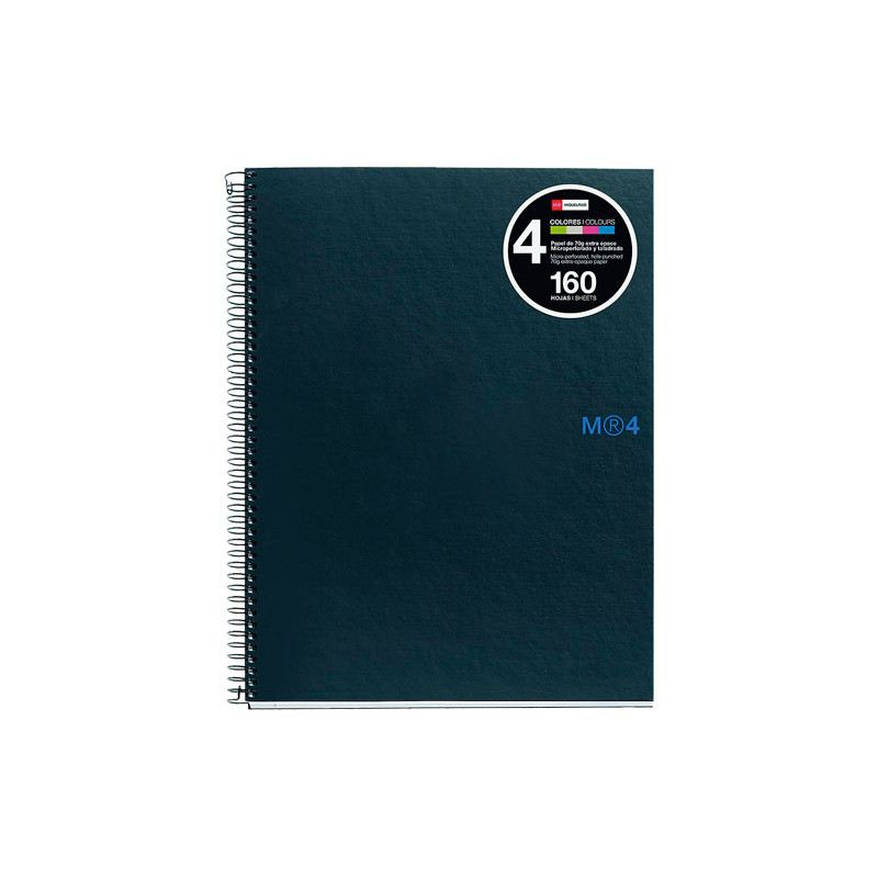 - Cuaderno espiral - Formato A4 - 160 hojas microperforadas - 4 taladros para archivar - Bandas de color lateral - Cubiertas de cartón extra duro - Papel extra opaco 70 gr/m². - Rayado: Liso