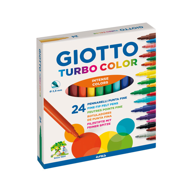 Colores turbo-alimentados. Cuando necesitas un color, ¡Giotto Turbo Color nunca te abandona! Creados a partir de tinta lavable e inocua, disponen de un punta redonda de fibra súper resistente bloqueada que nunca se hunde. Disponibles en 36 colores vivos, los rotuladores Giotto Turbo Color son 100% seguros gracias a su capuchón ventilado.