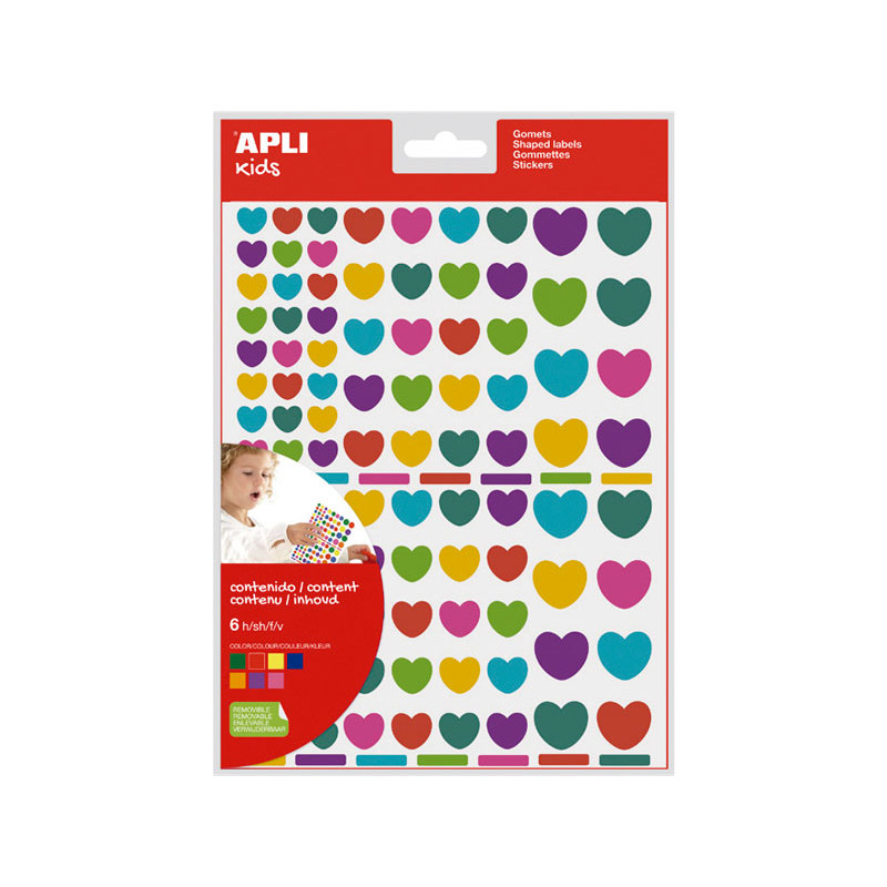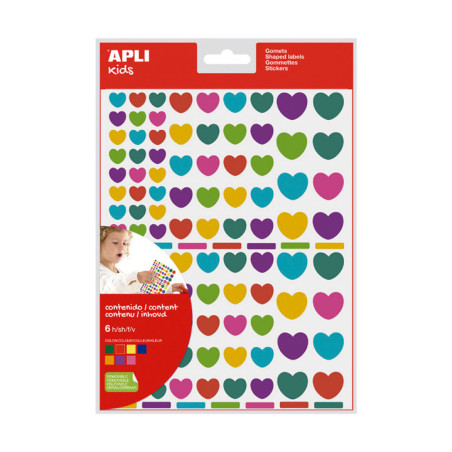 Bolsa de gomets en forma de corazón con adhesivo removible en diferentes colores: azul cielo, rojo, azul grisáceo, lila, verde, fucsia y amarillo. Tres tamaños surtidos. Cada bolsa contiene 6 hojas con gomets surtidos y 104 gomets por hoja, haciendo un total de 624 gomets por bolsa. Un producto indispensable en cualquier hogar y escuela. Antes de aprender a manejar el lápiz o las pinturas, con estos gomets, los niños pueden ir iniciándose en el mundo de los colores y las formas. Jugar y crear con gomets es una actividad básica que permite desarrollar la psicomotricidad fina y trabajar, al mismo tiempo, varias capacidades y habilidades como el conocimiento de los colores, las formas geométricas y los tamaños; el desarrollo de la lógica y la creatividad; el trabajo en equipo o el dominio del espacio, entre otros.