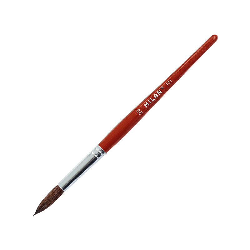 - Pincel redondo con mango corto de madera - Barnizado en color marrón y virola de aluminio - Composición: 70% pelo natural de cabra + 30% sintético - Adecuado para acuarela y técnicas acuosas