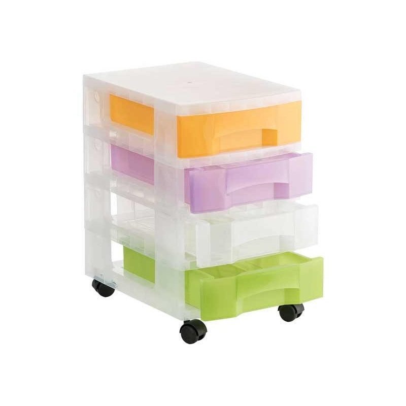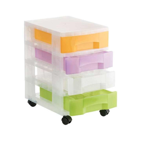 Torre de almacenaje con 4 cajones de 6 litros con ruedas. Fabricada en polipropileno copolímero, con aditivo antiestático que facilita la limpieza y evita la acumulación de polvo. Destaca por su gran resistencia y estabilidad. Ideales para el hogar, la oficina, centros educativos, clínicas, hospitales, etc. Carcasa y cajones en color translúcido. Medidas interiores de los cajones: 342x220x79mm. Medidas exteriores: 390x290x480mm. Fabricado en España