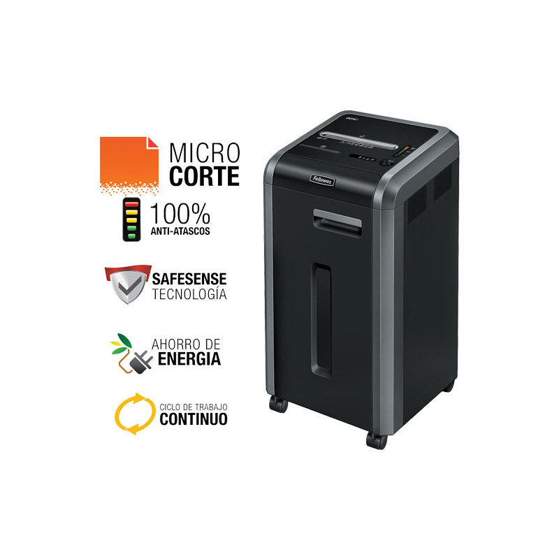 Destructora de documentos para uso continuo (+5 usuarios). Destruye hasta 16 hojas en microcorte de 2x12mm (Nivel de Seguridad P-5). Con sistema 100% anti-atasco que evita que se ponga en marcha la destructora si se introduce más papel del que admite. Ultra silenciosa para un buen ambiente de trabajo e indicadores luminosos que facilitan el proceso de destrucción señalando la cantidad de papel a introducir. Tecnología SafeSense de desconexión automática cuando la mano está demasiado cerca. Ciclo de trabajo de 30 minutos. Papelera extraíble de 60 litros y ancho de entrada de 24cm. Destruye grapas, tarjetas de crédito y CD's. Garantía de 2 años para la máquina y 7 años de garantía para las cuchillas. Dimensiones 78,11x43,50x45,09cm.