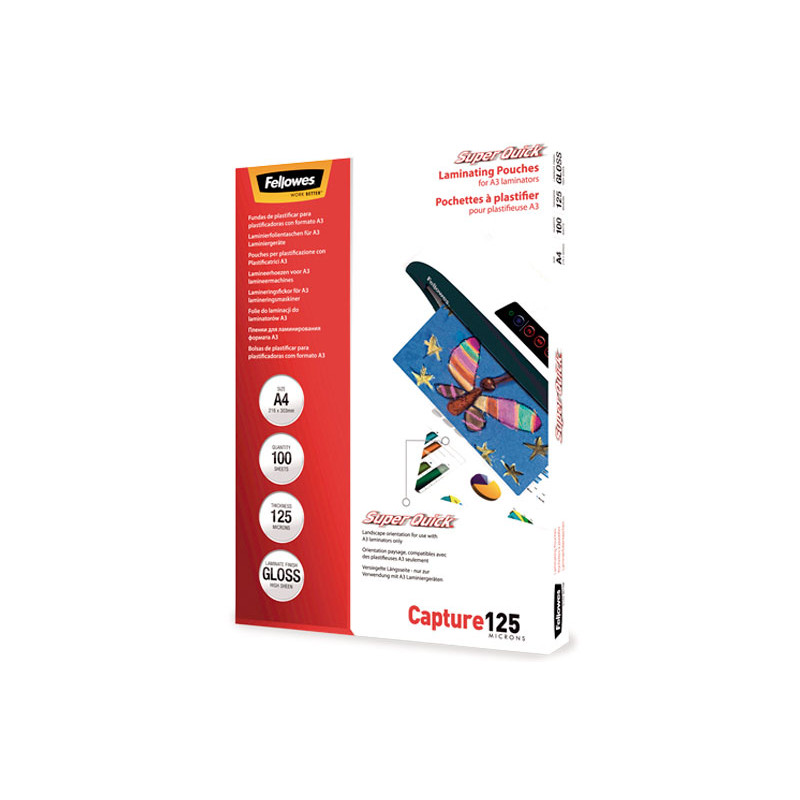 Plastifica un 40% más rápido con las fundas de plastificar de alta velocidad SuperQuick™ de Fellowes. Funda sellada en el lado largo, lo que las hace perfectas para un plastificación de alto rendimiento. Disponibles en 125 micras dependiendo de la calidad en el acabado que se quiera proporcionar al documento. Ideal para notas informativas, fotografías, materiales didácticos y documentos manipulados con frecuencia. Acabado en brillo en tamaño A4. Sólo compatible con las plastificadoras tamaño A3.