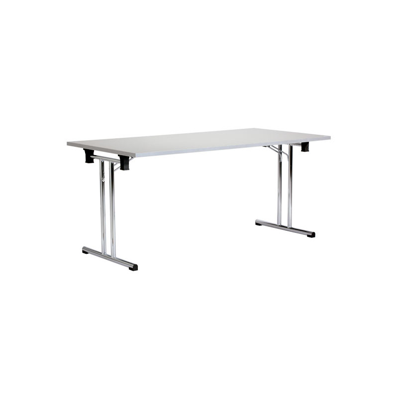 Mesa con tablero de melamina color gris de 25mm estructura en acero cromado plegable para solucionar todo tipo de necesidades. Ideal para salas polivalentes en las que se realizan todo tipo de actividades. Medidas 160x80cm. Fondo: 80cm. Fácil montaje