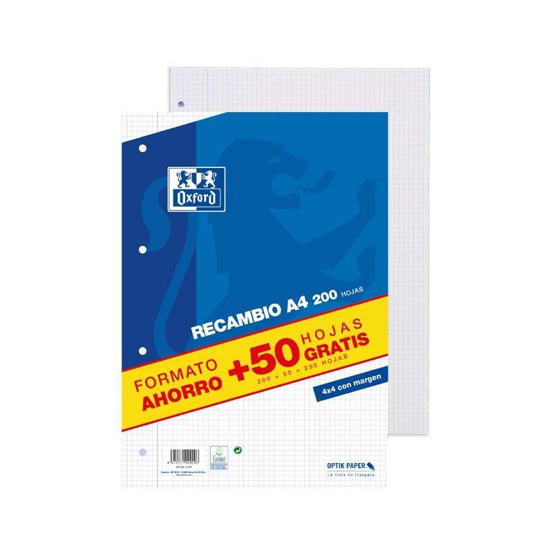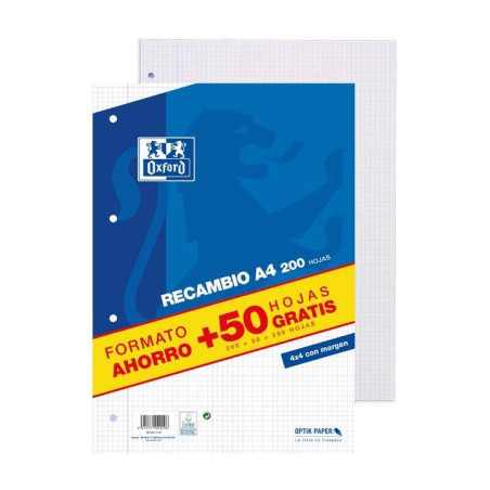 Recambio retractilado en paquete de hojas sueltas, permite mover y ordenar las hojas con libertad. Paquete con 200 hojas + 50 gratis, con 4 taladros para poder archivar las hojas cómodamente en carpetas de anillas o archivadores de palanca. Papel de 90gr. OptikPaper, la tinta no traspasa a la otra cara de la hoja. Cuadrícula 4x4 con margen izquierdo. Certificado EU Ecolabel.