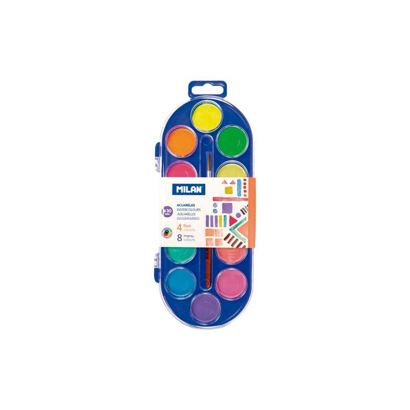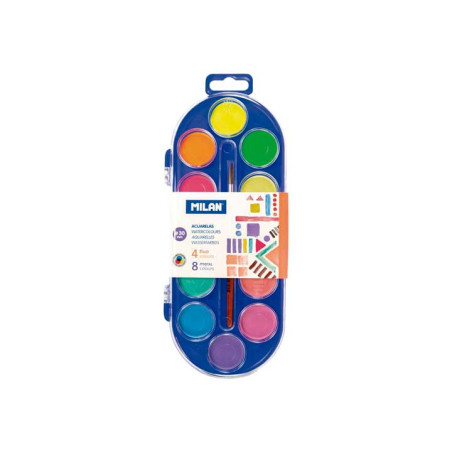 4 pastillas de colores Fluo y 8 pastillas de colores metalizados, de 30mm Ø. Incluye un pincel escolar de la Serie 101 especialmente indicado para acuarela. Los colores se pueden mezclar en los pequeños recipientesmezcladores de la tapa del estuche. Lasacuarelas MILAN se presentan enpastillas redondas y compactas. Sus colores se obtienen a partir de pigmentos y resistentes a la luz. Pueden lavarse fácilmente sobre la mayoría de tejidos.
