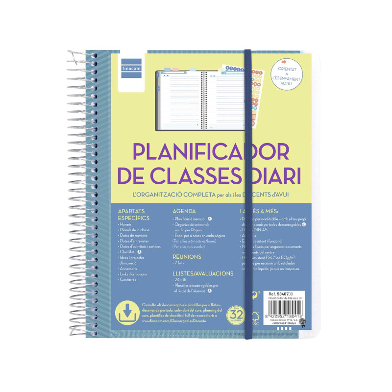 Planificador de clases 1 día página para organizar hasta 8 horas/materias y con espacio para anotaciones. Para adaptarse a cualquier especialidad del mundo educativo: profesores, maestros, tutores, educadores, etc. Dispone de apartados específicos para los docentes. Diseño actual y moderno tanto de la cubierta como de su interior. Con espiral simple metálica resistente, goma elástica y tapas de polipropileno que permiten la personalización de la portada. Incluye algunas hojas extra al principio para poder pegar documentos importantes del centro, 122 pegatinas y una funda transparente con capacidad para DIN A5. Con esquinas microperforadas para localizar rápidamente el día/semana en curso. Detalle de los apartados: Datos personales, hojas de contenido libre, horarios, planos de la clase, fechas de reuniones, fechas de entrevistas, fechas de actividades y salidas, checklist, ideas y proyectos de innovación, aniversarios, planificación mensual sin fecha, anualidad 1 Día Página sin fecha (para un curso lectivo) con espacio para detallar hasta 8 horas/materias, 24 hojas de listas/evaluaciones (hasta 32 alumnos), 7 hojas de reuniones, links, formaciones y contactos. La organización completa para los docentes.
