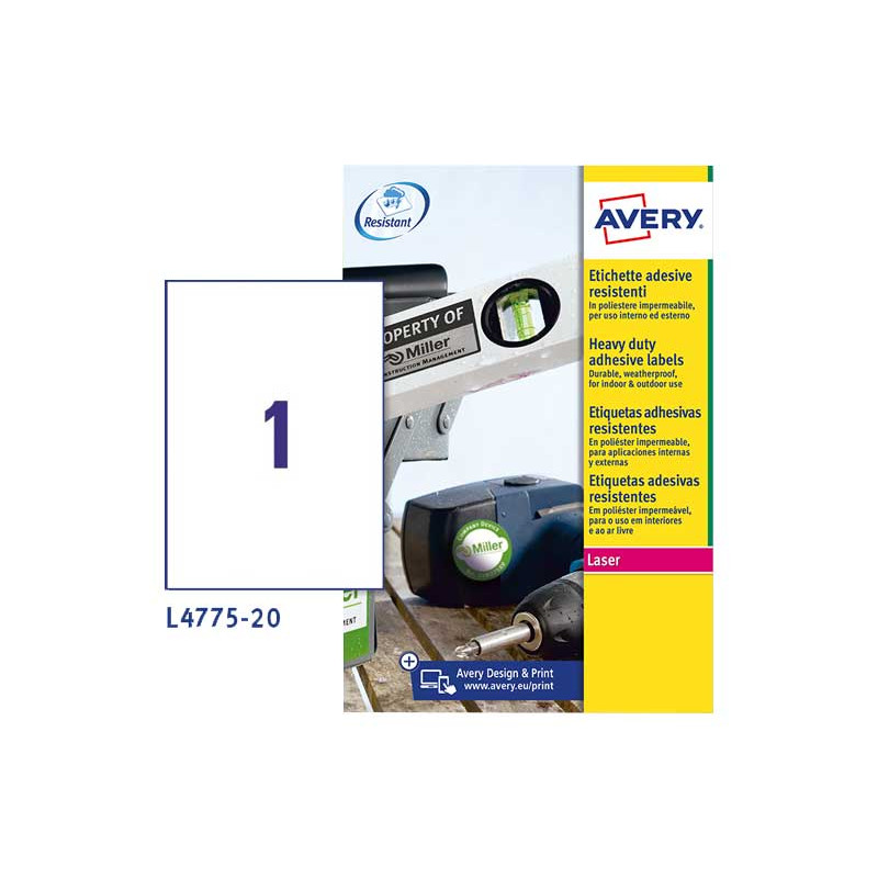 Etiquetas adhesivas fabricadas en poliéster blanco extra resistente Resistentes a la intemperie, soportan las condiciones más extremas: humedad, bajas y altas temperaturas, aceites, grasas, rayos UVA, detergentes. Ideales para uso externo, no se desgarran y se pueden aplicar en metal, vidrio, plástico y madera. 1 etiqutas por hoja, Cajaj de 20 etiquetas para impresora láser.