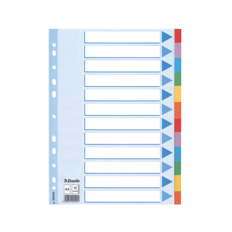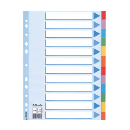 - Separadores - Fabricados en cartón - Gramaje: 200 g. - Con carátula índice - Colores vivos - Formato: A4 - Posiciones: 12