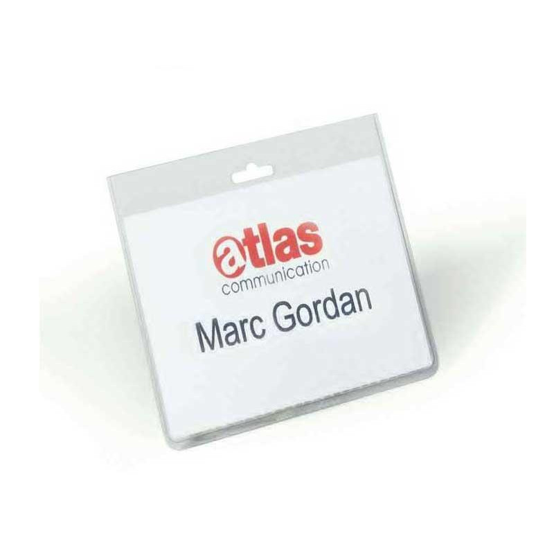 Funda portanombres cerrada, para proteger la etiqueta. La perforación para el clip permite la combinación con cadenas, cintas para portanombres y cordones extensibles. Medidas interiores: 60x90mm.
