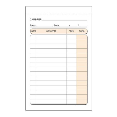- Talonario de camareros preimpresos - 50 hojas - Formato de bolsillo - Duplicado autocopiante - Incluye separador de cartón - Papel original litos blanco de 50gr y papel autocopiante químico rosa - Medidas: 9x14cm - Idioma catalán