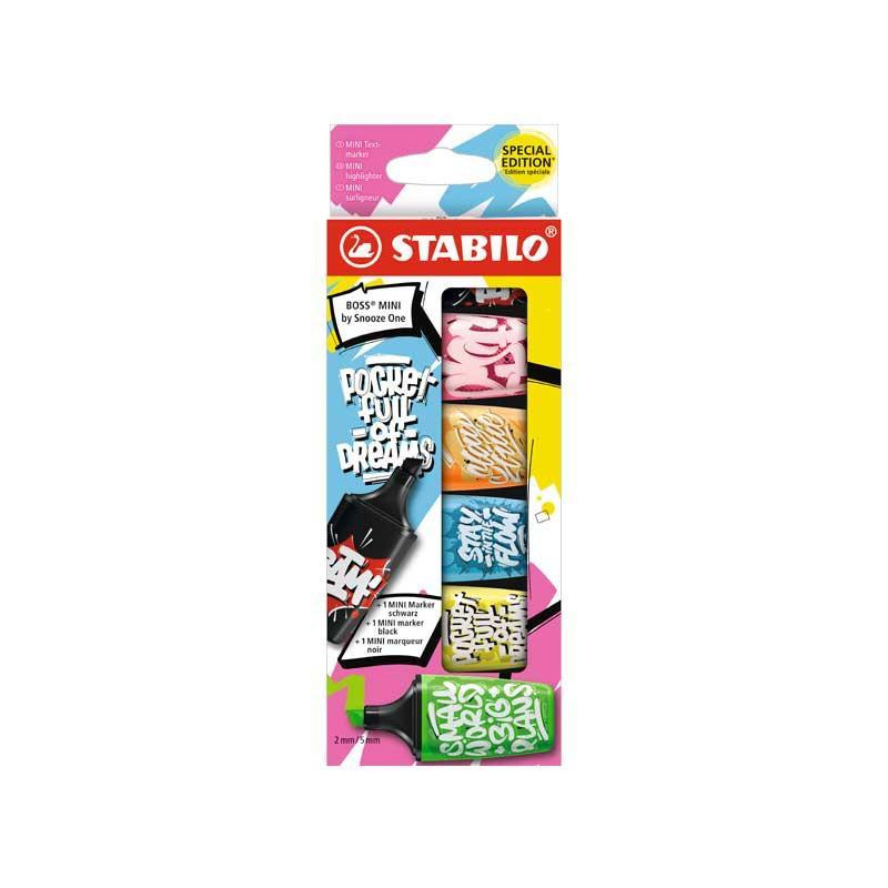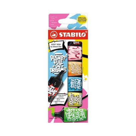 Marcador fluorescente con capuchón y cuerpo de plástico. Tinta con base acuosa ideal para proyectos creativos, sombreados, lettering y bullet journals. Punta biselada con 2 anchos de trazo 2-5mm. Tecnología Antisecado, hasta 4 horas de protección antisecado. Recargable con recambios de tinta compatibles. Colores neón con diseños inspirados en grafitis, cada uno con un mensaje.