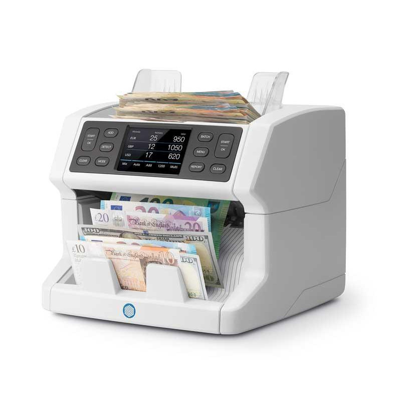 Contadora de billetes fiable de alta velocidad, cuenta de manera rápida el valor de billetes mezclados y los verifica simultáneamente con respecto a hasta siete características de seguridad. Es perfecta para cuando se tenga que procesar grandes fajos de billetes de forma rápida. Cuenta el valor de hasta 1.200 billetes por minuto. Gracias a su diseño y a la tecnología avanzada de doble sensor CIS, puede verificar hasta siete características de seguridad de los billetes, como tinta ultravioleta, tinta infrarroja, tinta magnética, hilo metálico, imagen, tamaño y grosor. Cuando la contadora encuentre una posible falsificación, emitirá una alarma acústica y visual para notificárselo. Bastará con que retirar el billete sospechoso del fajo y pulsar Start para seguir contando. Gracias a su tolva de carga frontal, se puede seguir añadiendo billetes a la contadora mientras cuenta. Además de la alimentación continua, tiene múltiples funciones automatizadas para facilitar el proceso de conteo. Función de añadir para sumar automáticamente la cantidad de billetes contados en diferentes ciclos y use la función de fajos para crear fajos iguales de billetes. Pantalla táctil a todo color de alta resolución. Programado para identificar automáticamente y autenticar billetes en divisas diferentes (EUR | USD | GBP | CHF | PLN | CZK | BGN | HRK | HUF | RON | SEK | NOK | DKK | TRY | SCT | NIR). Muestra el detalle del conteo completo por divisa y denominación. Capacidad de la tolva de carga superior: hasta 500 billetes por conteo. Capacidad del apilador: para de contar después de 220 billetes, retirar el fajo para continuar. Incluye cable de alimentación, kit de limpieza, cubitera antipolvo y cable USB.