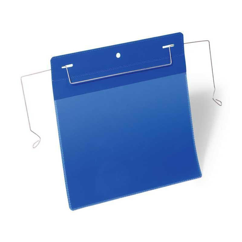 Funda de color azul en la parte posterior y ventanilla transparente. Fabricada en polipropileno. Resistentes a roces y lectores tipo escáner. Fácil intercambio de etiquetas. Con alambre galvanizado y flexible para una fijación ligera y segura a contenedores, marcos de madera, rejas y palés. Aptas para uso exterior gracias a la solapa que protege los documentos del polvo y la humedad. Formato A5 horizontal.