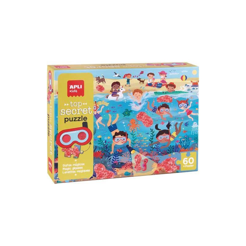 Puzle secreto con temática de playa. Incluye 60 piezas de tamaño 6 x 6 cm. Tamaño del puzle: 52 x 34 cm. Los más pequeños se divertirán montando este puzle y usando las gafas mágicas. Descubre lo que se esconde en las zonas sombreadas en rojo. Contiene un póster de tamaño real para facilitar el montaje y unas gafas mágicas. Diseño infantil, colorido, claro y simple. Fácil manejo para los más pequeños: piezas resistentes, seguras y fáciles de manejar. Cartón de 2 mm de grosor con acabado mate e indiana en el dorso. Los puzles son el juego ideal para los niños ya que, mientras se divierten jugando, les ayudan a mejorar y desarrollar multitud de capacidades y habilidades: mejoran su concentración, la observación, la memoria y la resolución de problemas; y desarrollan la percepción espacial, la psicomotricidad fina, el reconocimiento de formas, la coordinación mano-ojo y las habilidades matemáticas. Además, los puzles les ayudan a mejorar su autoestima y motivación gracias al hecho de terminar un juego con éxito. Recomendado para niños a partir de 4 años.