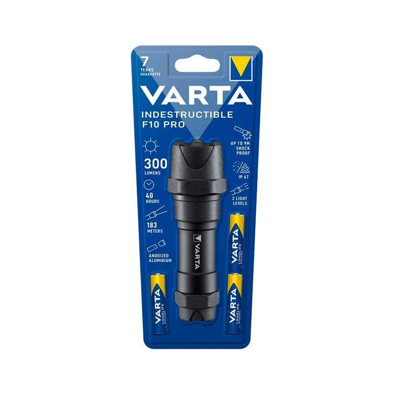 Linterna robusta óptima para cualquier actividad relacionada con trabajo manual, camping, picnics, senderismo, ciclismo, escalada y otras actividades al exterior. Carcasa de aluminio resistente, a prueba de agua y golpes de hasta 9 metros. Con luz LED de 6W y 2 niveles de potencia, alumbra hasta 183m con 300 lúmens. La autonomía de la linterna es de hasta 40h e incluye 3 pilas alcalinas AAA VARTA High Energy. Tiene un mango de goma antideslizante así como una cuerda para atar la linterna de forma segura.
