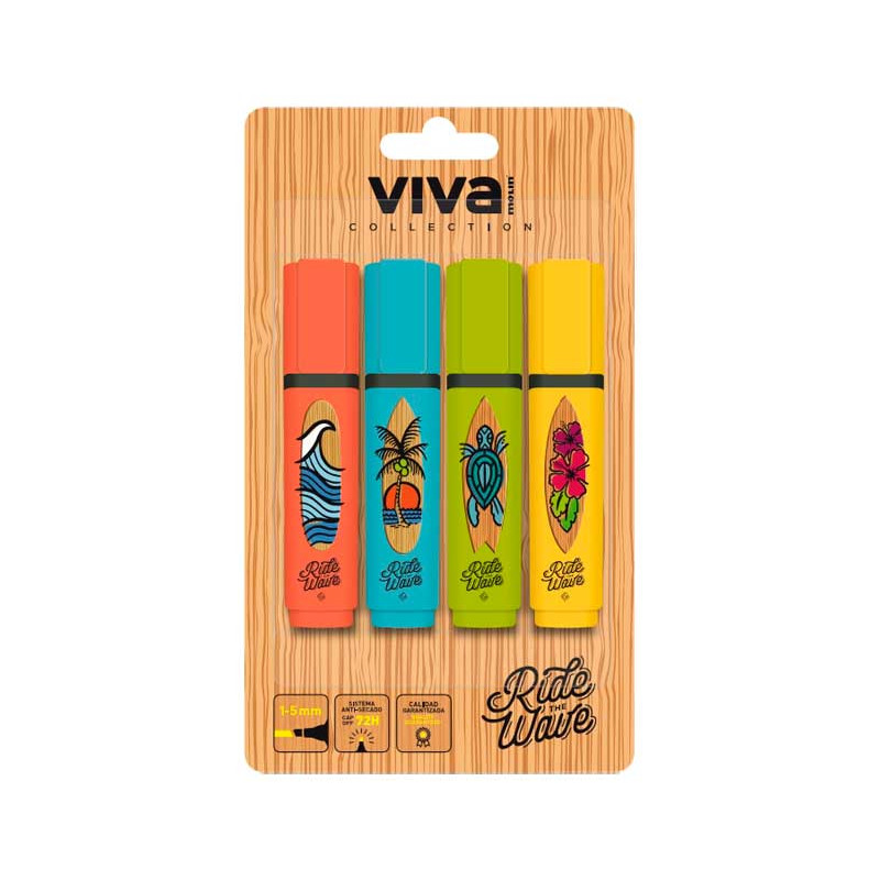 Marcadores fluorescentes con punta biselada, con trazo de 1-5mm. Sistema anti-secado de hasta 72h destapado. Divertidos diseños de la cultura del surf en los años 50's. Colores: naranja, azul, verde y amarillo.