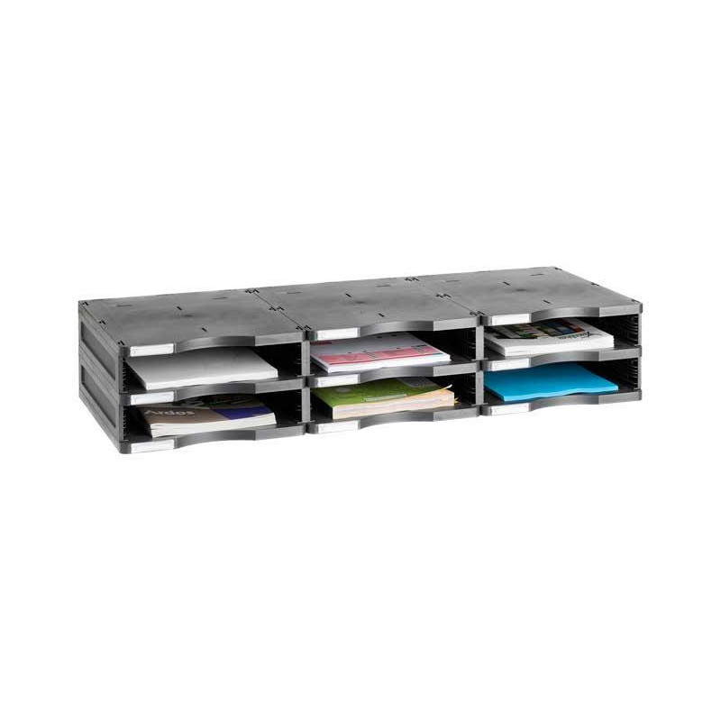 Módulo apilable de 6 compartimentos, compuesto por 3 bases y 2 alturas. Estructura estándar modular de gran capacidad, ideal para clasificar todo tipo de documentos de forma ágil, rápida y en el menor espacio. Estos módulos permiten crear diferentes alturas y construcciones mediante el uso de ampliaciones Estándar o de gran capacidad Jumbo. Posibilidad de utilizar complementos adicionales como cajones con frontales y separadores. Compatible con formatos A4 y folio. Fabricado en poliestireno 100 % reciclado y 100% reciclable. Incluye tarjetero identificador de 64x12mm en cada hueco. Fácil montaje de piezas encajables sin necesidad de herramientas. Medidas exteriores: 36x90x16,5cm. Medidas interiores por hueco: 34x27x5.8cm.