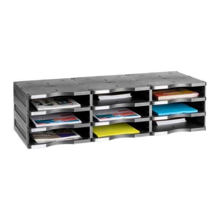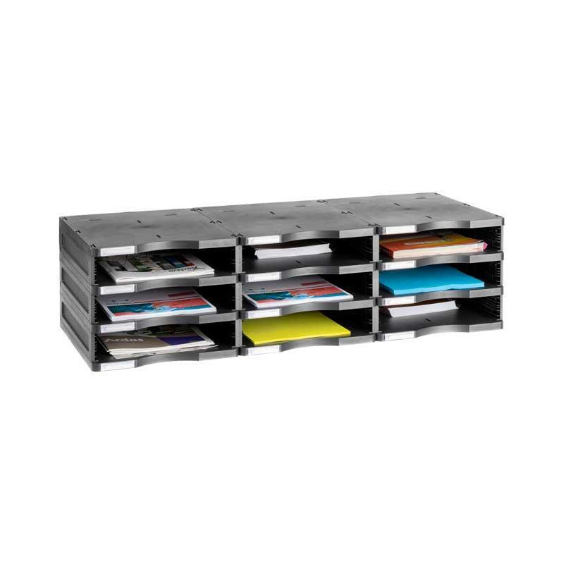 Módulo apilable de 9 compartimentos, compuesto por 3 bases y 3 alturas. Estructura estándar modular de gran capacidad, ideal para clasificar todo tipo de documentos de forma ágil, rápida y en el menor espacio. Estos módulos permiten crear diferentes alturas y construcciones mediante el uso de ampliaciones Estándar o de gran capacidad Jumbo. Posibilidad de utilizar complementos adicionales como cajones con frontales y separadores. Compatible con formatos A4 y folio. Fabricado en poliestireno 100 % reciclado y 100% reciclable. Incluye tarjetero identificador de 64x12mm en cada hueco. Fácil montaje de piezas encajables sin necesidad de herramientas. Medidas exteriores: 36x90x24cm. Medidas interiores por hueco: 34x27x5.8cm.