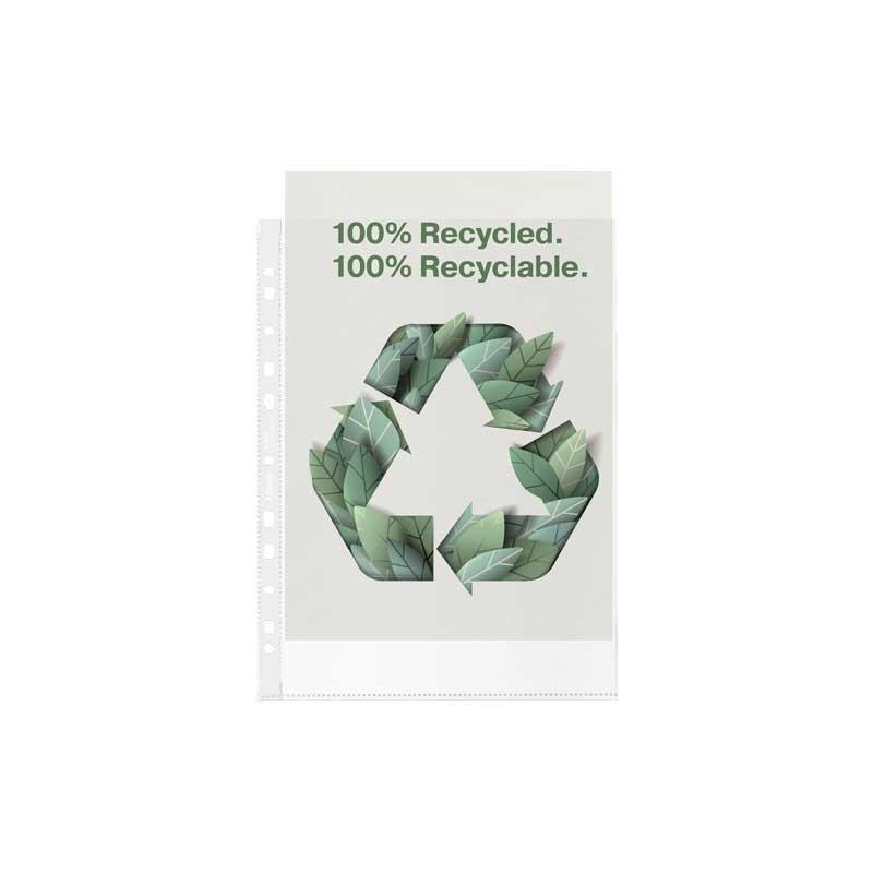 Fundas protectoras ecológicas, para documentos. Fabricada con PP resistente, 100% reciclado en formato A4. Tira reforzada universal de 11 taladros, para usar en cualquier carpeta de anillas o archivador de palanca. Todo el producto puede reutilizarse y reciclarse de nuevo. Apertura superior, ideal para su uso en la oficina, en la oficina de casa y en la escuela. Superficie mate en relieve con film de calidad de 100 micras de grosor. El film Copy Safe evita que el texto pase del papel al plástico. El material libre de ácido evita que el papel se vuelva amarillento con el tiempo, perfecto para archivar documentos importantes durante mucho tiempo. Se presenta en una caja de cartón que también es 100% reciclada y reciclable.