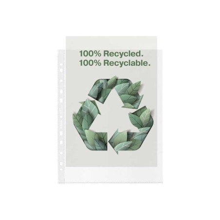 Fundas protectoras ecológicas, para documentos. Fabricada con PP resistente, 100% reciclado en formato A4 maxi. Ideales para el archivo de documentos de mayor volumen, revistas y catálogos de hasta 80 hojas. Tira reforzada universal de 11 taladros, para usar en cualquier carpeta de anillas o archivador de palanca. Todo el producto puede reutilizarse y reciclarse de nuevo. Apertura superior, ideal para su uso en la oficina, en la oficina de casa y en la escuela. Superficie mate en relieve con film de calidad de 100 micras de grosor. El film Copy Safe evita que el texto pase del papel al plástico. El material libre de ácido evita que el papel se vuelva amarillento con el tiempo, perfecto para archivar documentos importantes durante mucho tiempo. Se presenta en una caja de cartón que también es 100% reciclada y reciclable.